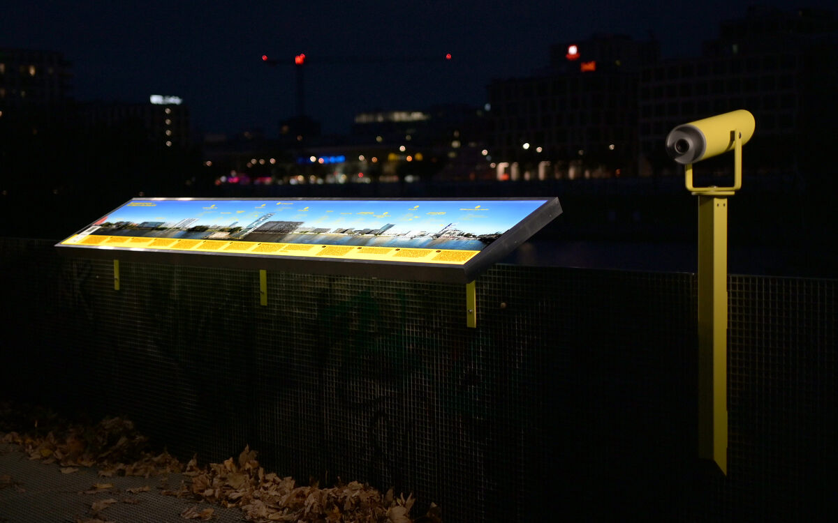 Webseite besuchenDas »Spreepanorama« des Künstler:innenkollektives Guerilla Architects blickt in Berlin Kreuzberg über die Spree auf die neuen Gipfel der Spekulation. Abgebildet ist ein langer Streifen hochpreisiger Immobilen, fusioniert zu einem unwirklichen und artifiziellen Architektur-Rendering. Zu jedem Gebäude ist die Verkaufsvergangenheit aufgeschlüsselt, teilweise inklusive der gezahlten Summen. Ich habe zu Hintergründen der Gebäude recherchiert, das Panorama fotografiert und zusammengesetzt und die Grafik entwickelt. Das Panorama war von November 2021 bis März 2022 im öffentlichen Raum installiert. Unterstützt durch DRAUSSENSTADT.